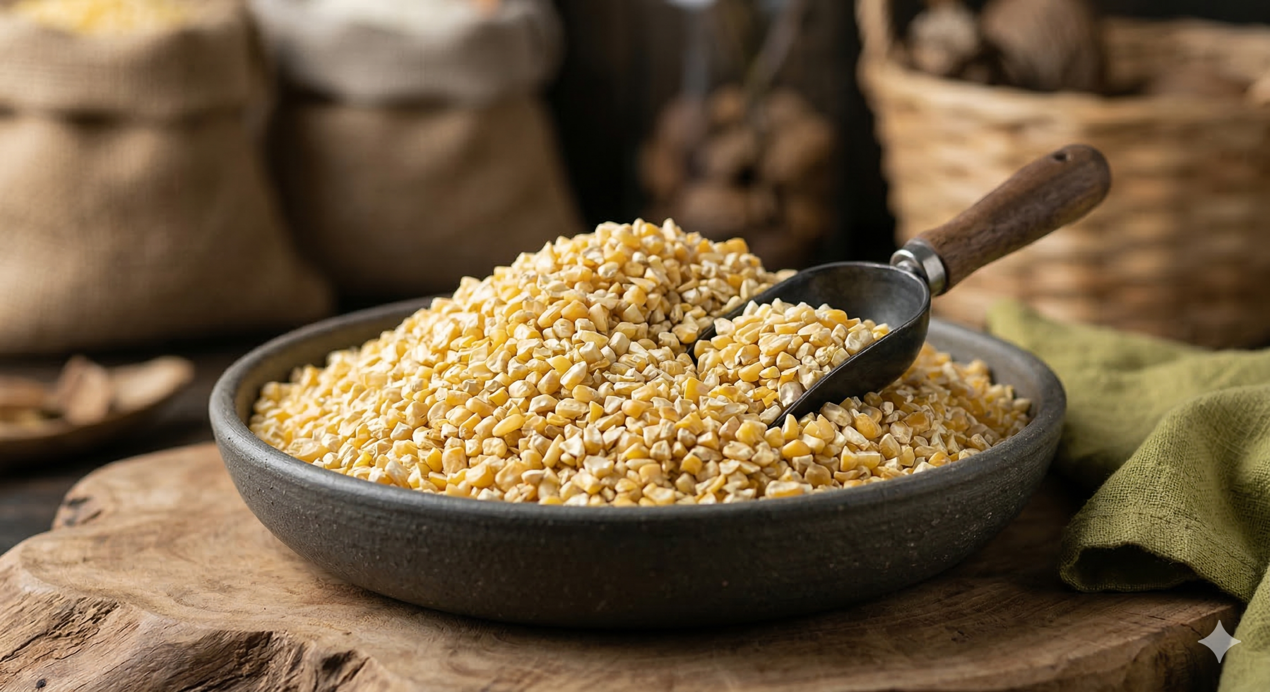 A Quirera Média (ou Xerém Médio) é o grão de milho triturado em partículas intermediárias. Ela se posiciona exatamente entre a quirera fina (quase um pó/grânulo miúdo) e o milho quebrado grosso. É o formato mais equilibrado para quem busca aproveitamento nutricional sem perder as características físicas do grão.